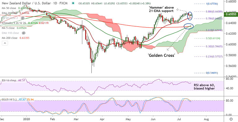 'Hammer' and 'Golden Cross' patterns on the daily chart support gains in the pair. Price action is above cloud and major moving averages.