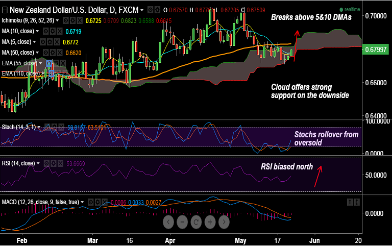NZD/USD is extending recovery from 2-month lows at 0.6709 hit on 19th May and is attempting to retake the 0.68 handle.