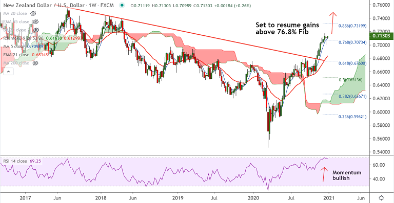 The pair trades with a bullish bias and is on track to test 88.6% Fib at 0.7320. NZD/USD is extending gains after previous week's Dragonfly Doji, consolidates above 76.8% Fib.
