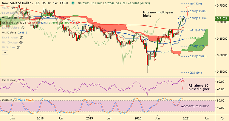 NZD/USD was trading 0.21% higher on the day at 0.7100 at around 05:20, outlook bullish.