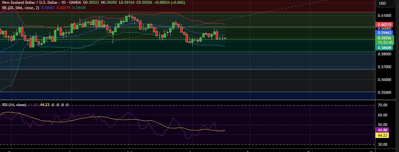 • Support is seen at 0.5915 (50%fib)and break below could take the pair towards 0.5869(Lower BB).