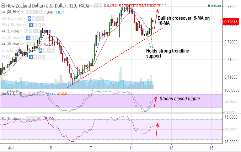 - Supports on the downside are seen at 0.7241 (2H 5-MA), 0.7225 (rising trendline). Strong resistance is seen at 0.73.