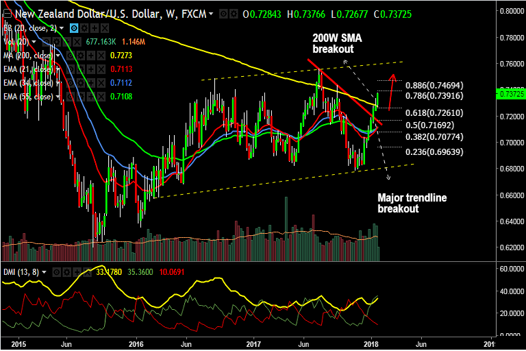 Support levels - 0.73 (5-DMA), 0.7272 (200W SMA), 0.7261 (61.8% Fib retrace of 0.7558 to 0.6780 fall), 0.72