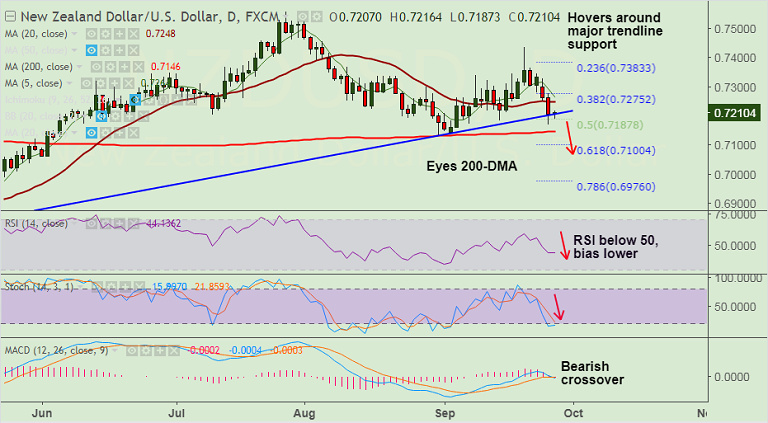- NZD/USD trades largely muted around major trendline support at 0.72 levels, intraday bias bearish.
