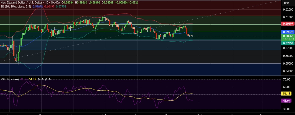 • Support is seen at 0.5814(61.8%fib)and break below could take the pair towards 0.5814(Lower BB).