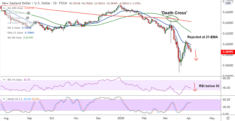 Little support seen on the downside till lower BB at 0.5589. 5-DMA is immediate resistance at 0.5931. Break above 21-EMA could change near-term dynamics.