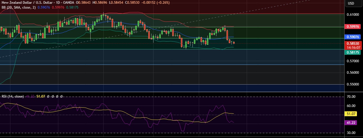 • Support is seen at 0.5819(Lower BB)and break below could take the pair towards 0.5805(61.8%fib).