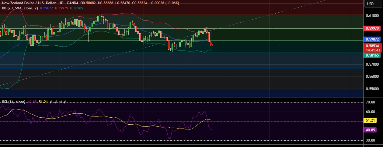 • Support is seen at 0.5818(Lower BB)and break below could take the pair towards 0.5801(61.8%fib).