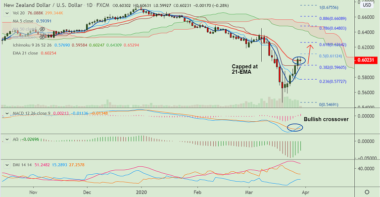 'Death Cross' (bearish 50-DMA crossover on 200-DMA) to limit upside. Rejection at 21-EMA will see downside resumption.