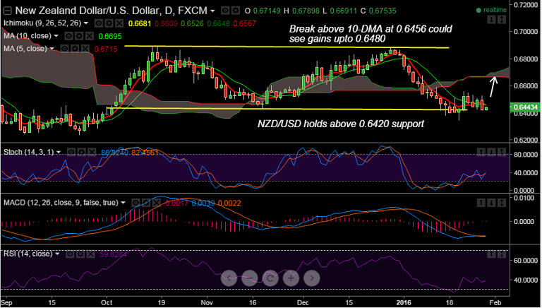- On the upside, immediate resistance is located at 0.6456 (10-DMA), above which it could extend gains to 0.6480 (Jan 18 highs).