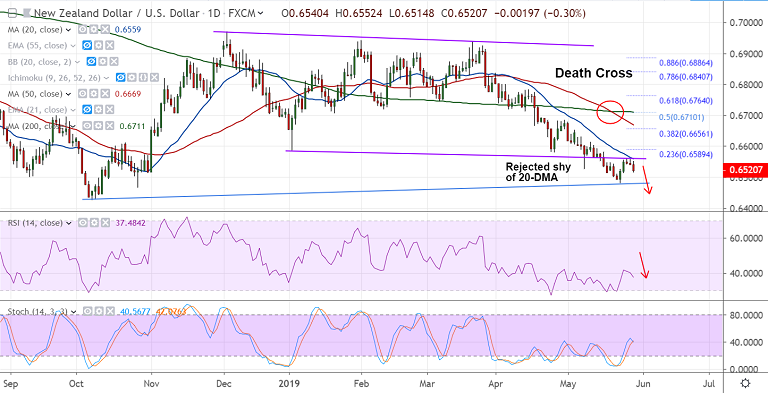 NZD/USD extends weakness for the 3rd straight session, remains capped below 20-DMA.