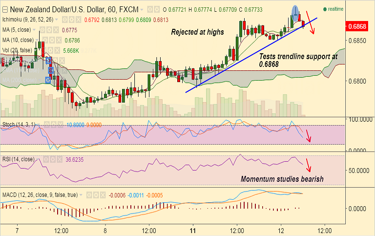 FxWirePro: NZD/USD rejected at highs, tests strong trendline support at 0.6868