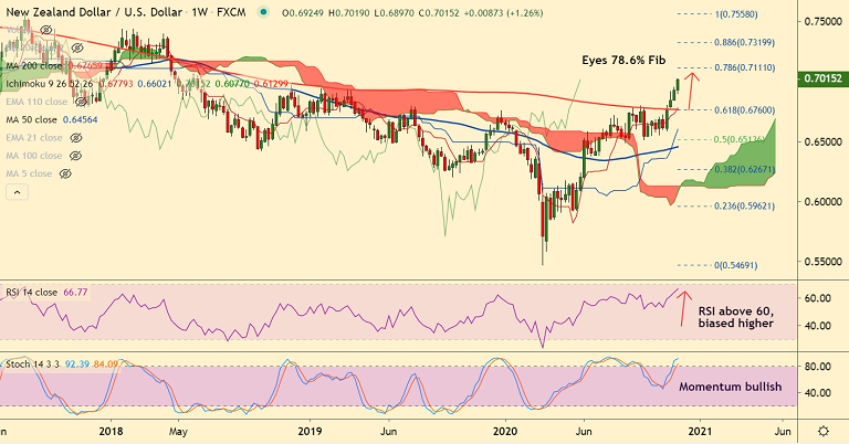 NZD/USD was trading 0.21% higher on the day at 0.7014 at around 04:35 GMT. The pair has resumed upside after a brief pause in the previous session.