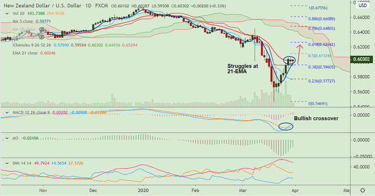 Breakout at 21-EMA will see next immediate hurdle at 0.6112 (50% Fib). Break above eyes 61.8% Fib at 0.6264.