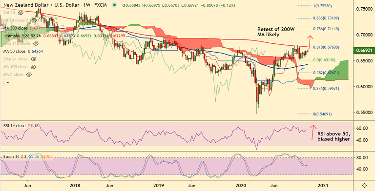 NZD/USD was trading 0.25% higher on the day at 0.6692 at around 05:30 GMT. The major is set to resume upside after a brief consolidation above the daily cloud.