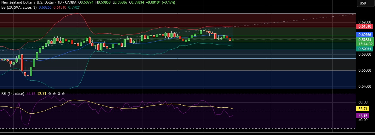• Support is seen at 0.5949(50%fib)and break below could take the pair towards 0.5923(Lower BB).
