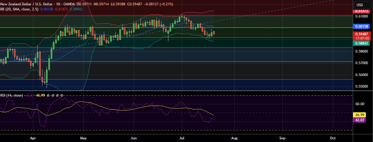 • Support is seen at 0.5921(50%fib)and break below could take the pair towards 0.5883(Lower BB).