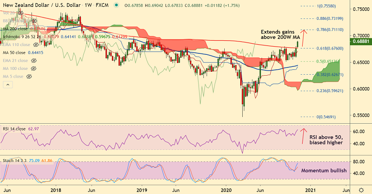 5-DMA is immediate support at 0.6810. Retrace below 200W MA at 0.6768 negates near-term bullishness.