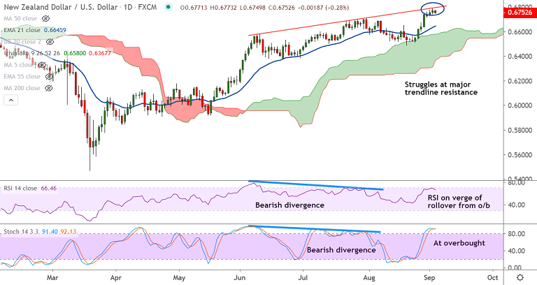 The major is showing retreat from 13-month highs at 0.6789 hit on Sept 2nd trade.