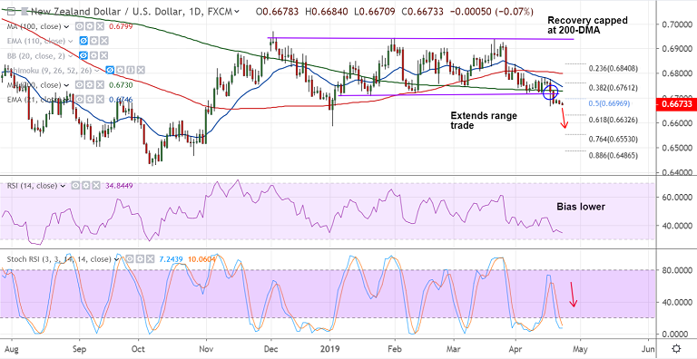 - NZD/USD is extending range trade, marginally down 0.07% at 0.6673 at 0430 GMT.