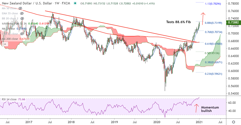 NZD/USD trades above 200 month MA for the first time since June 2018. The pair is in a major bull trend and is currently hovering around 88.6% Fib at 0.7320. The pair is all set to challenge the 2018 high of 0.7437.