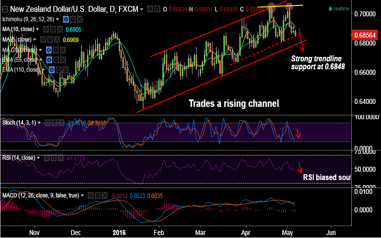 - NZD/USD broke the overnight consolidation phase to the downside and is now testing major trendline support at 0.6848.