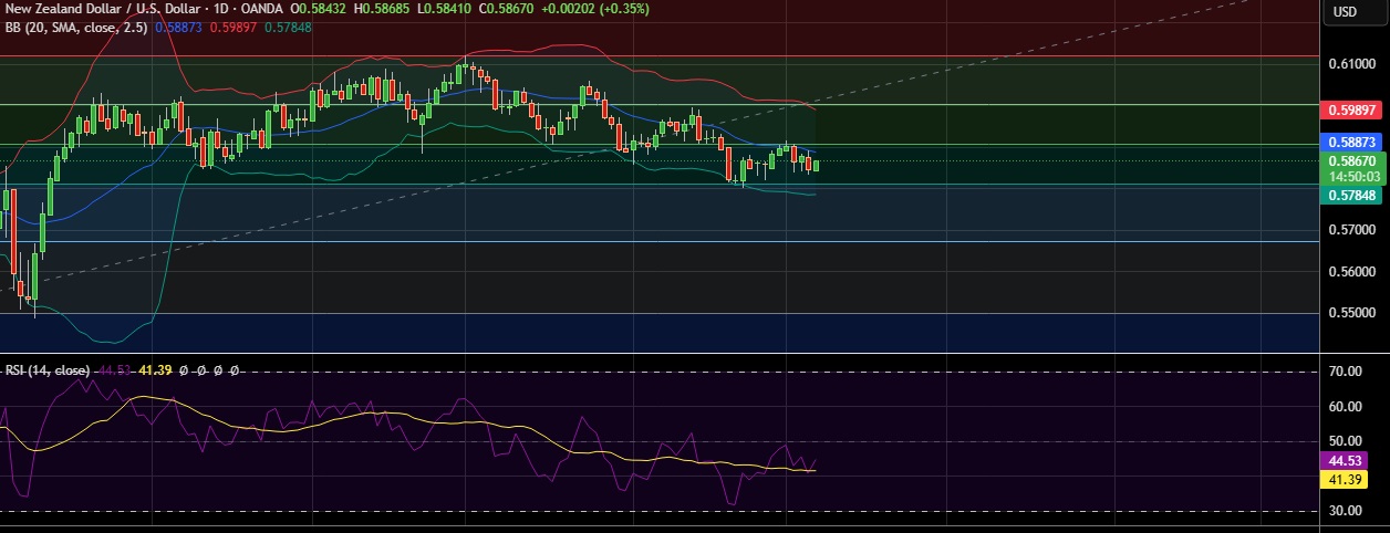 • Support is seen at 0.5813(61.8%fib)and break below could take the pair towards 0.5787(Lower BB).