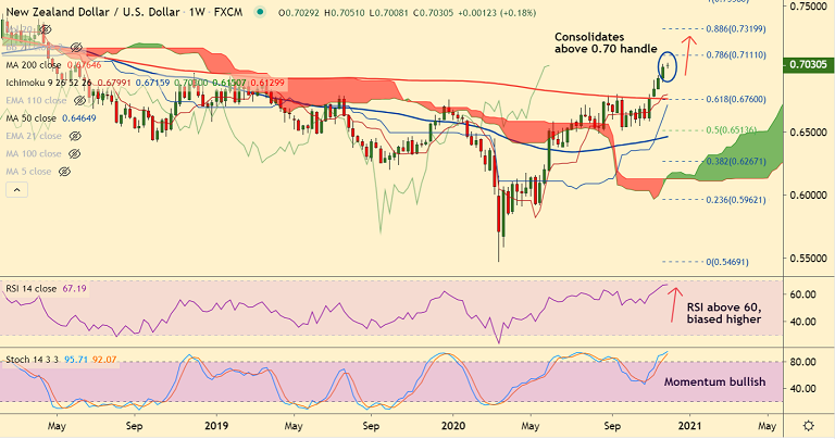Major bias is strongly bullish, but overbought conditions may cause some pullbacks. Watch out for close below 5-DMA (0.7013) for weakness. Next major support lies at 200H MA at 0.6975.