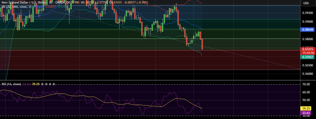 • Support is seen at 0.05734 (23.6%fib) and break below could take the pair towards 0.5708(Lower BB).