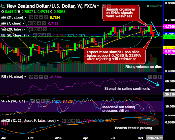 Expect more slumps upon slide below support 0.7080 & 21DMA after rejecting stiff resistance