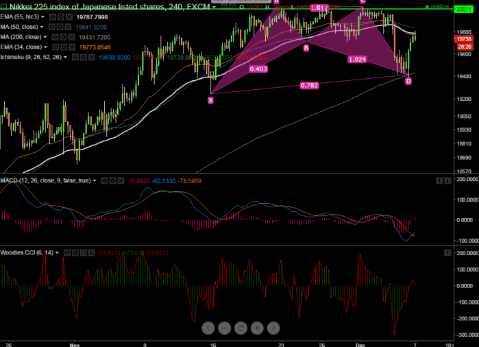 - Nikkei has made a low of 19384 on Friday and recovered from that level. It is currently trading at 19800