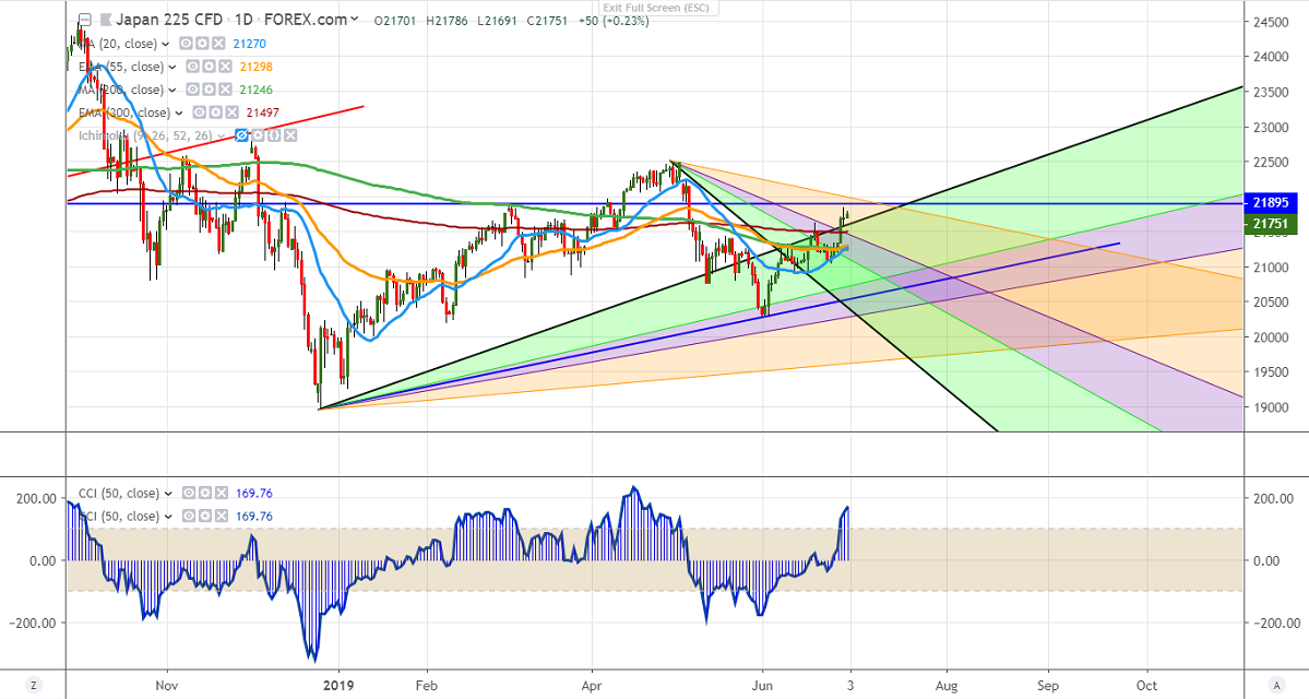 Nikkei is trading flat after hitting 2-month high yesterday. The index was following the footsteps of US markets. The optimism in the trade deal between the US and China is the main reason for the jump in global markets. But slight weakness in global manufacturing PMI especially Eurozone and the US is increasing the chance of global growth slowdown.US ISM PMI came at the lowest level since 2016 yesterday at 51.7. The index hits high of 21846 and is currently trading around 21746.