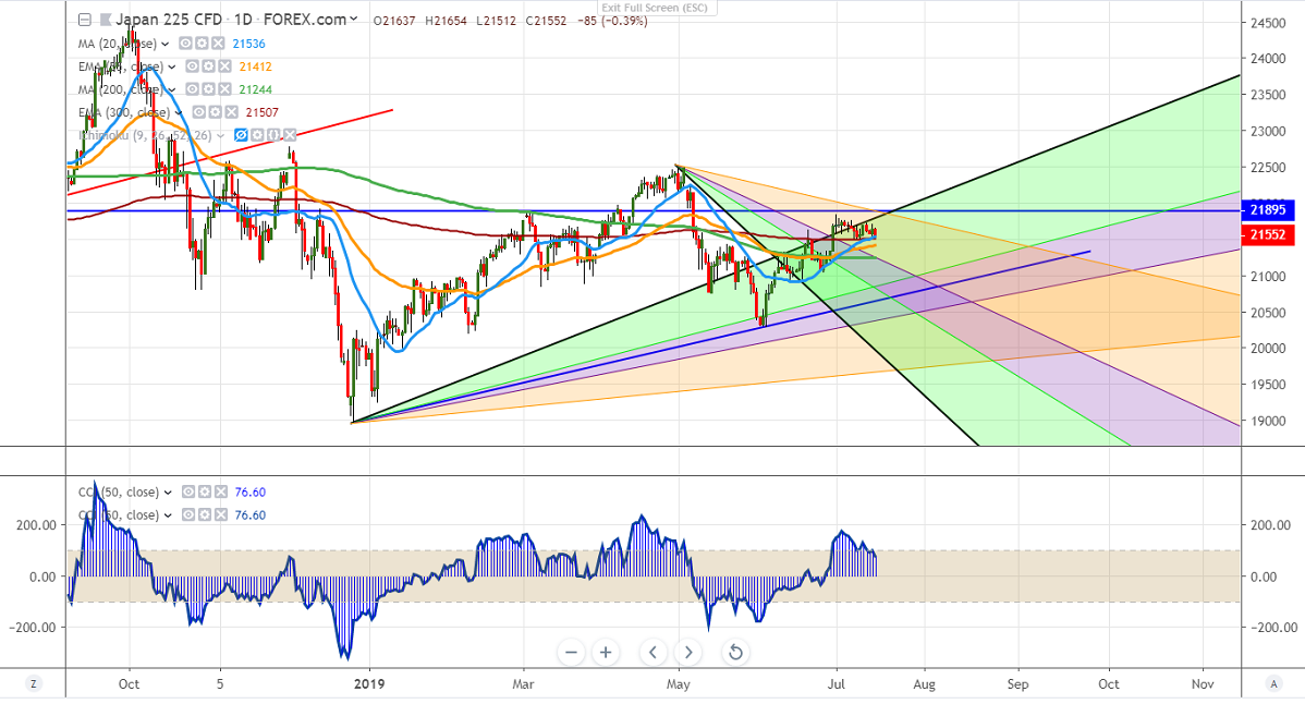 Nikkei is trading slightly lower after weaker than expected Chinese GDP growth. Chinese GDP came at 6.2% in the second quarter lowest in 27 years and it hurts investor sentiment. Markets eye US retail sales and corporate earnings for further direction. The index hits high of 21677 and is currently trading around 21647.