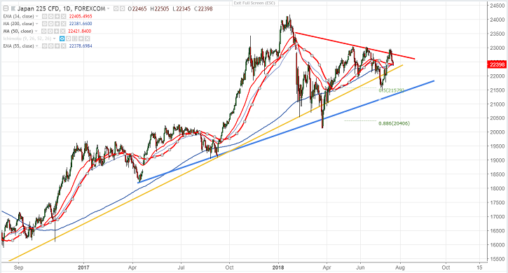 - Asian markets are trading lower on account of escalating trade war between US and China. US equities was trading lower after new threats to slap duties on all US imports from China and Trump’s criticizing fed on rate hike. US market has closed marginal lower with Dow Jones at 25058 (0.04% lower) and S&P500 2801 (0.09% lower). Chinese market has jumped more than 100 points from the low of 2753. It is currently trading around 2849. USD/JPY which is the main indicator of geo political tension is trading weak for third consecutive day. US futures is trading higher with Dow Jones at 25029 (0.02% lower) and S&P500 2796 (0.07% lower). Nikkei is currently trading around 22388 0.35% lower.
