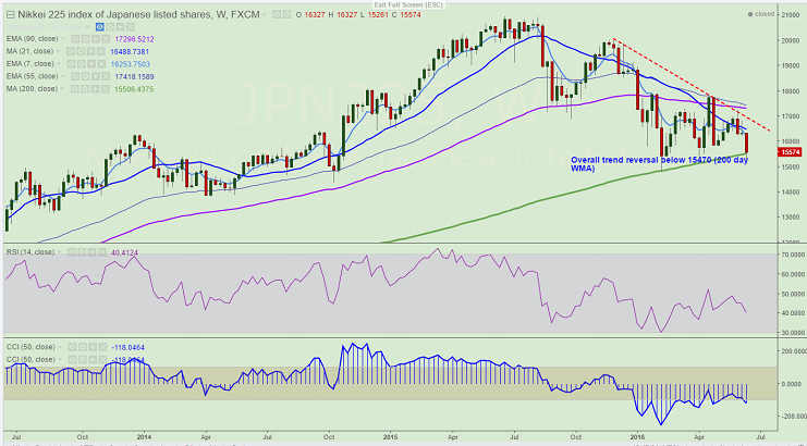 - Nikkei Index have made a low of 15260 in previous week and closed at 15574. The index is expected to trade extremely volatile till Thrusday on account of Brexit referendum. It is currently around 15574.