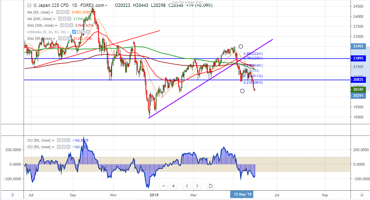 Nikkei trades lower and hits 4-1/2 month low on trade war between US and other countries. US President Trump said that due to increase of illegal immigrants from US planning to impose tariff on Mexico. USDJPY is trading lower and lost nearly 150 pips. It hits 5-month low and currently trading around 108.15.US 10 year bond yield declined sharply and hits lowest level since since Sep 2017 and spread between US 3 month and 10 year yield widened to 20 basis point highest level since Mar 2019. The index hits low of 20291 and is currently trading around 20363.