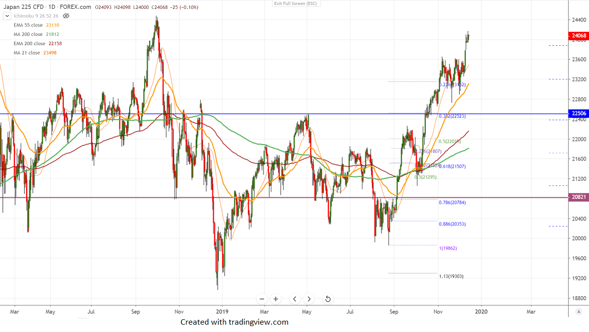 Nikkei continues to trade higher for the past 4 months after forming a minor bottom around 19984. It has surged more than 20% and hits 14-month high around 24168. The jump was mainly due to a strong global stock market in hopes of phase one trade deal and easing yen. It is currently trading around 24058.