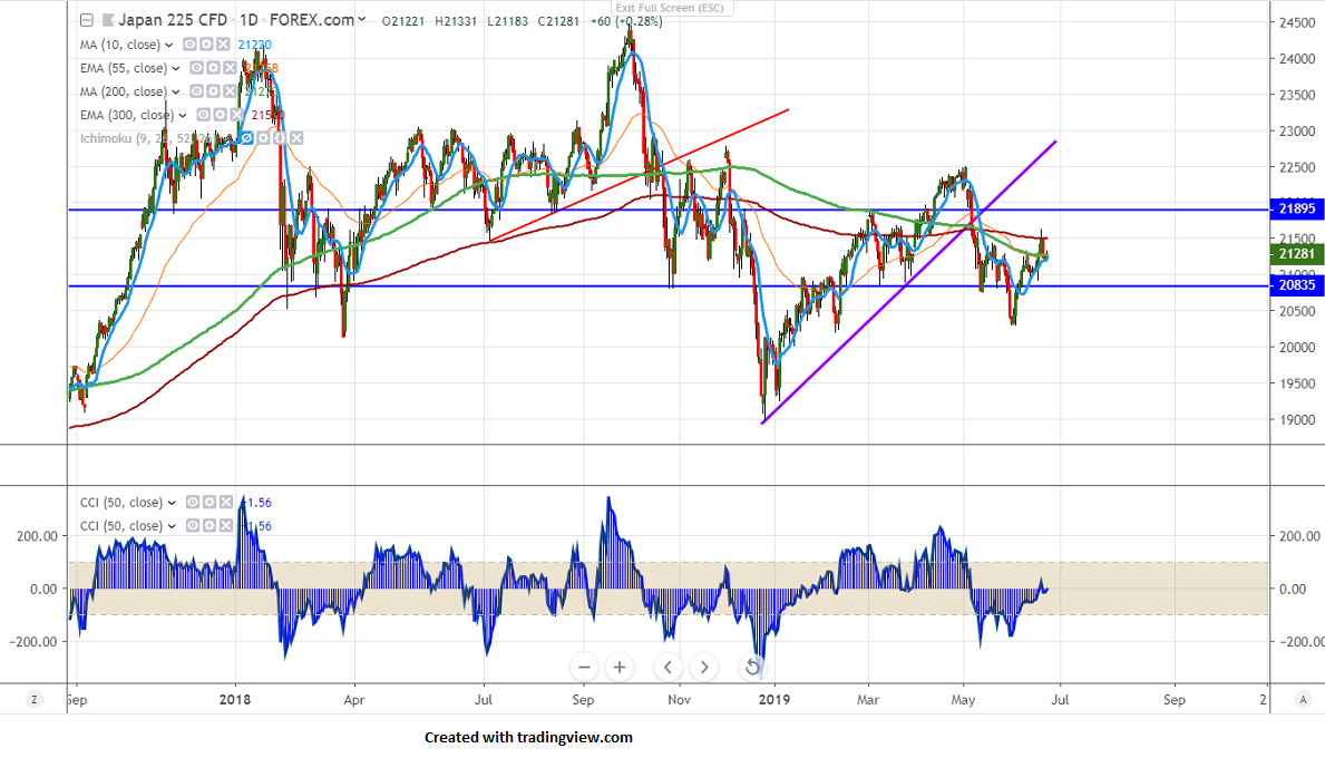 Nikkei trades slightly after a 2days of weakness. The overall trend for this week is to be flat until the G-20 meeting. According to Xinhua state-run Chinese news agency, Chinese President Xi Jiniping will attend the G-20 meeting in Japan this week. Oil rallied more than 9% previous week on Middle East tension The index hits intraday high of 21331 and is currently trading around 21306.