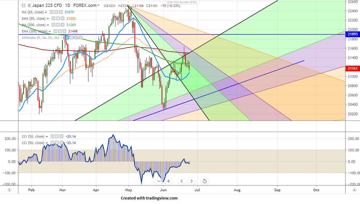 Nikkei trades slightly lower on strong yen. The demand for Safe-haven assets has increased on account of geopolitical tension between the US and Iran. Markets are eagerly waiting for US President Trump and the Chinese President Xi Jinping meeting in the G20 summit. The index hits an intraday low of 21106 and is currently trading around 21106.