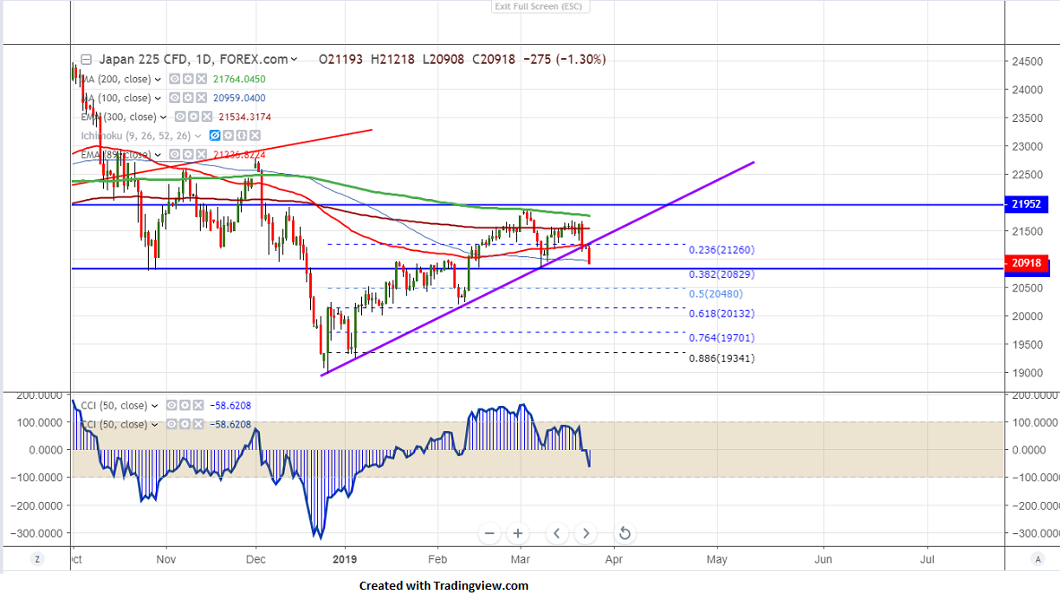 Asian markets tumbles especially Nikkei lost more than 3% on strong yen and global growth concern. Wall Street has closed lower on declining US bond yields. US 3- month and 10 year has inverted for first time since 2007.The yen was trading higher against all majors especially against USD and gained more than 100 pips from high of 110.89 made on Friday. US markets has closed lower with Dow Jones at 25550 (1.77% lower) and S&P500 2800 (1.90% lower).Nikkei hits intraday low of 20908 and is currently trading around 20928.