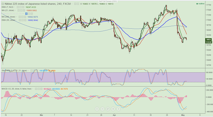 - Nikkei index slightly recovered after making a low of 15837.It is currently trading around 16016.