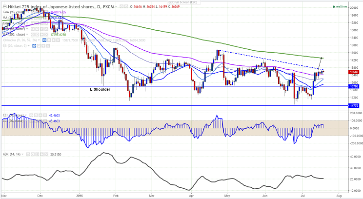- Nikkei225 has jumped till 16656 and slightly declined from that level.It is currently trading around 16569.