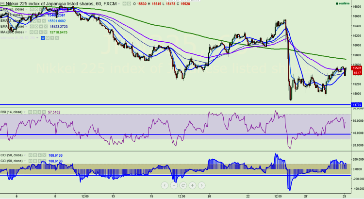 - Nikkei225 has recovered till 15568 after making a low of 14990 on Monday. It is currently trading around 15510.