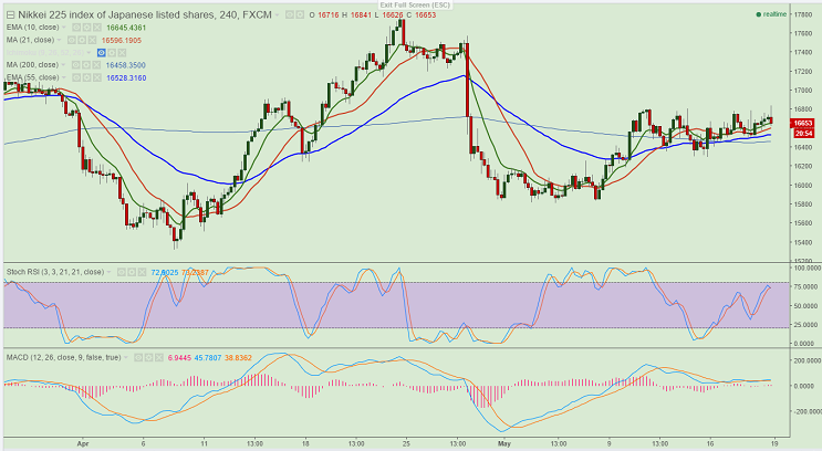 - Nikkei index has slightly retreated after making a high of 16838. It is currently trading around 16648.