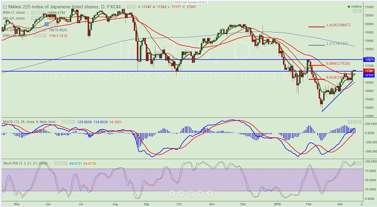 - The index has slightly retreated after making a high of 17307. It is currently trading around 17209.Short term trend is bullish as long as support 16750 holds.