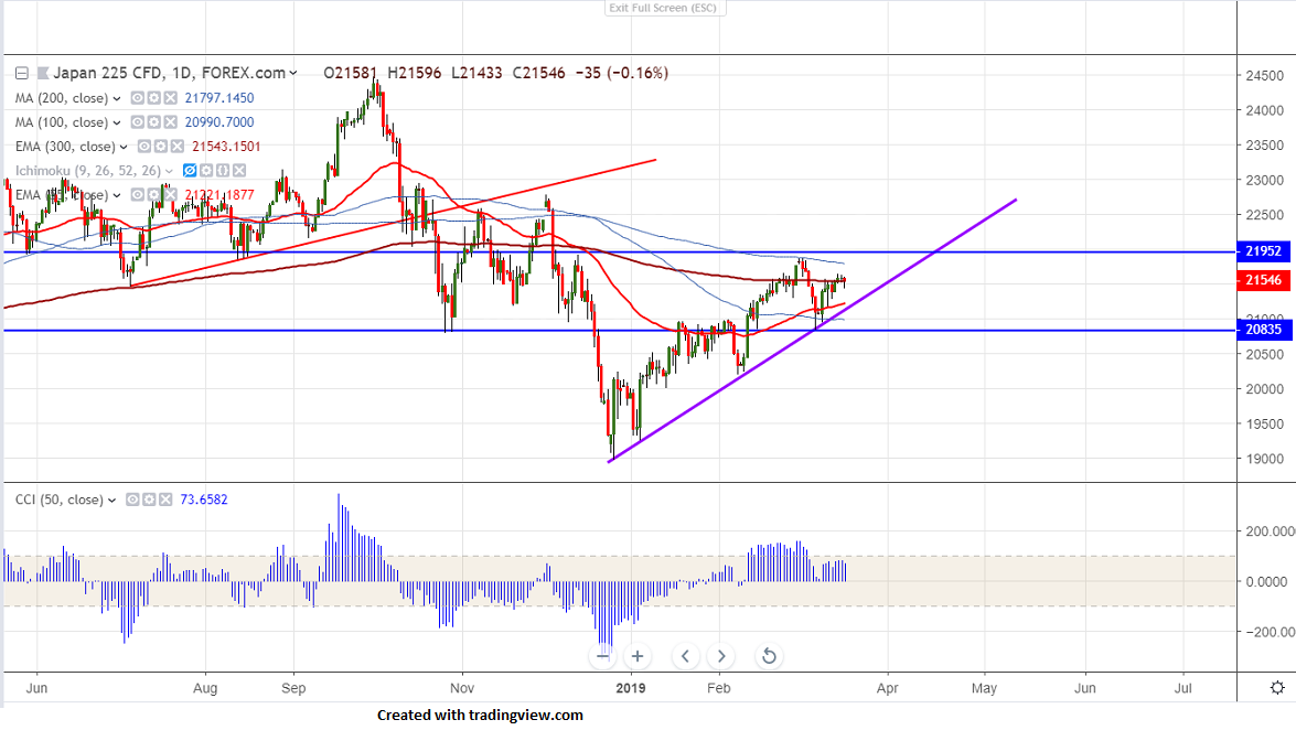 Asian markets are trading flat especially Nikkei consolidating in narrow range of 200 points for past two trading days ahead of Fed meeting.The slightly stronger yen is putting minor pressure on Nikkei. USDJPY has lost nearly 70 pips from recent high of 111.90 level. US markets has closed higher for 7th consecutive day with Dow Jones at 25914 (0.25% higher) and S&P500 2832 (0.37% higher).Nikkei hits intraday low of 21433 and is currently trading around 21541.