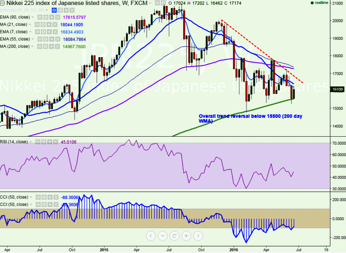 - Nikkei Index has recovered sharply after making a low of 15574. The index has broken major resistance 16000 on hopes that Britain will stay in EU.