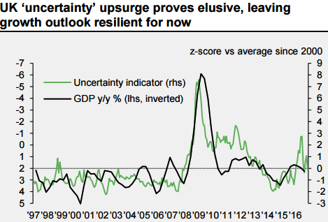 More broadly, with the post-referendum upsurge in uncertainty proving short-lived, the main drag on the economy is now expected to come through the hit to consumer purchasing power resulting from the weakness of sterling, with the bulk of the impact due to take effect in 2017.
