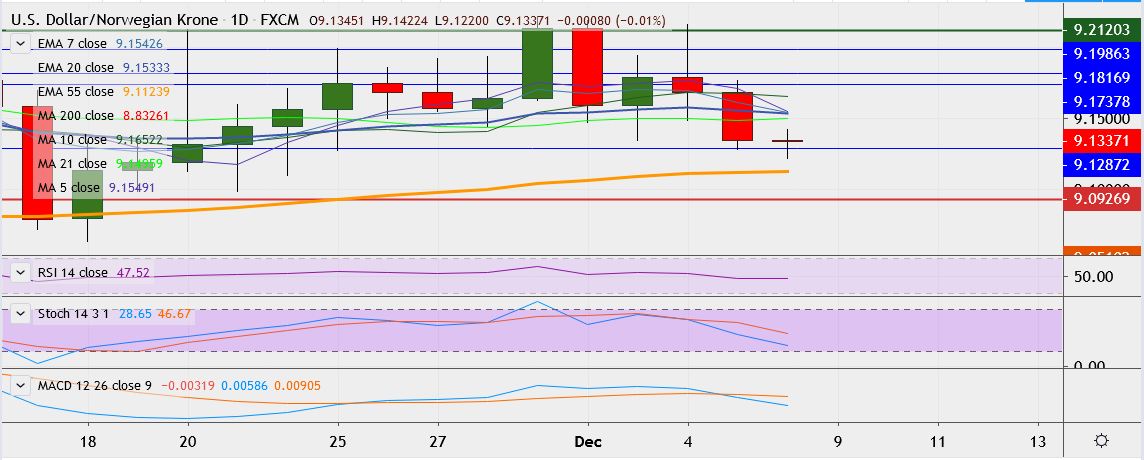 - USD/NOK trades 0.05 percent lower at 9.1330, having touched a low of 9.1220, its lowest since November 22.