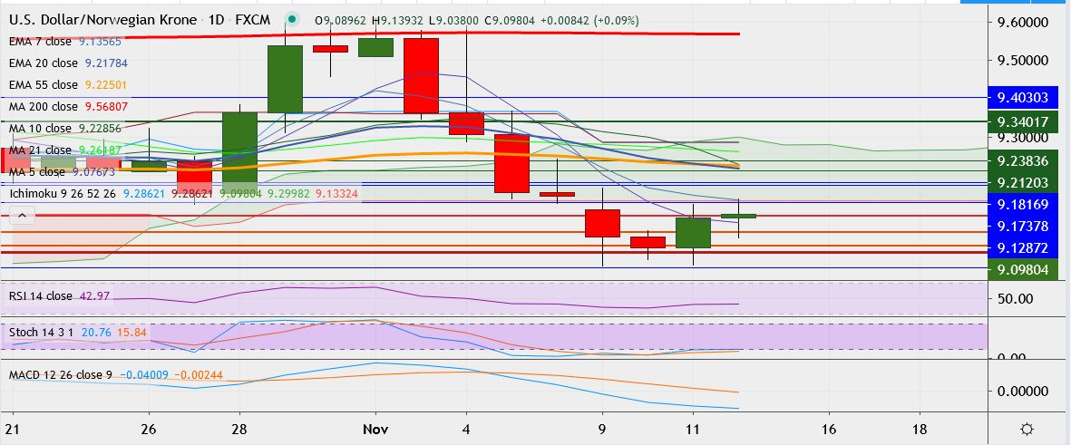 - USD/NOK trades 0.1 percent higher at 9.0981, having touched a low of 8.9644 on Monday, its lowest since September 10.